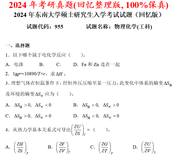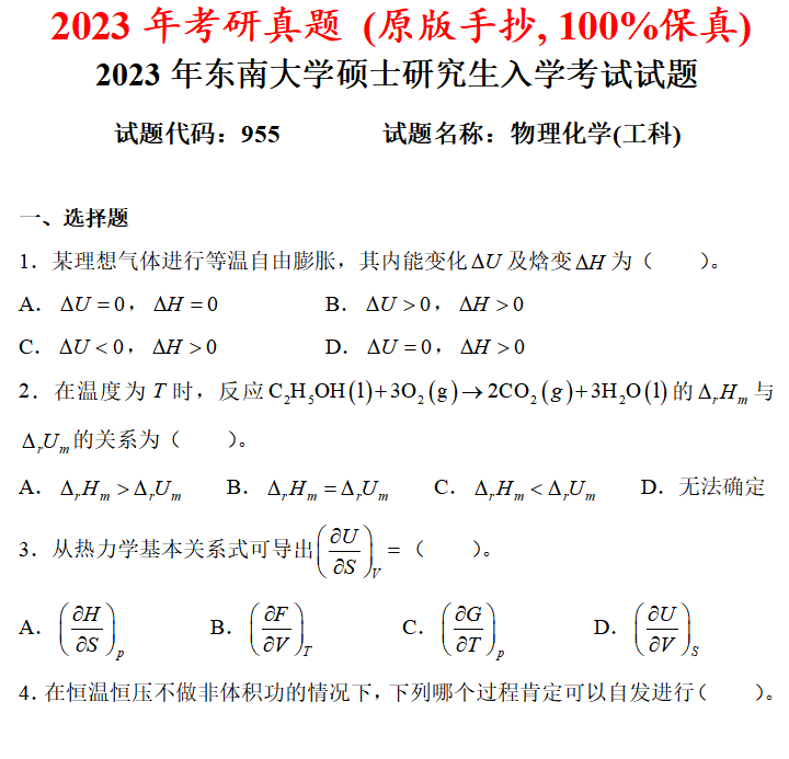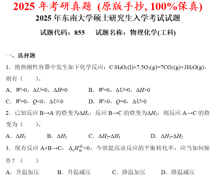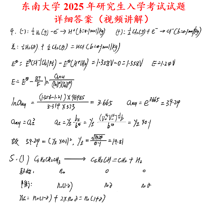 东南大学855物理化学工科考研真题答案化学工程考研网学天地