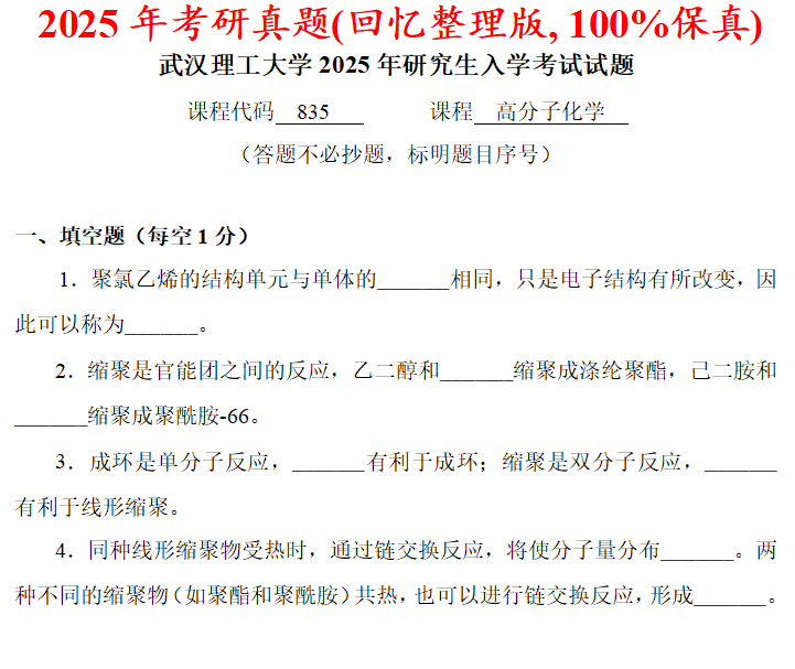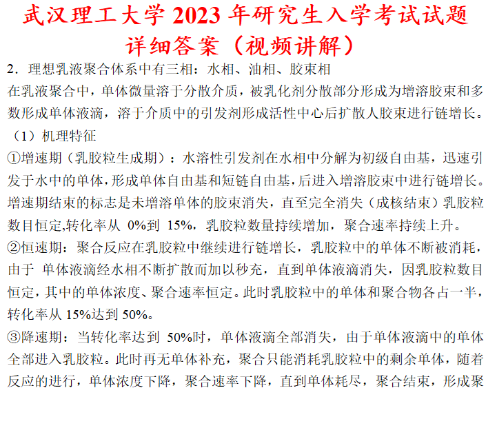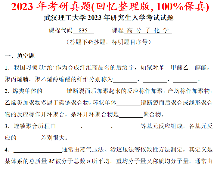 武汉理工大学835高分子化学考研真题答案武理工材料学院网学天地